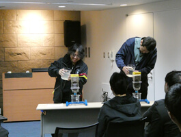 参加者から代表2名が、藻岩浄水場で実際に使用している薬剤を用いた「濁った水を透明にする」作業の一部を体験し、浄水プロセスへの理解を深めました。